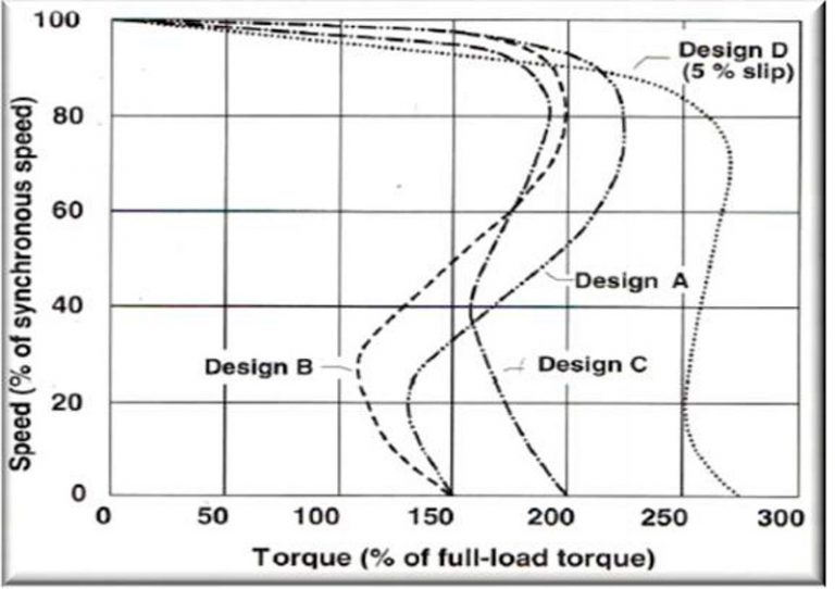 Cuando los fabricantes van diseñar un motor, hay muchas variables para un rotor-estator dado, por ejemplo: el número de barras, material, la forma, diseño de anillo extremo, entrehierro y la construcción, todos estos impactarán directamente en el par de velocidad. En la normas NEMA de un motor de inducción se define por las características de par, intensidad, velocidad, resistencia y la reactancia del rotor, junto con la cantidad de flujo del estator, y los pares mínimos y máximo de corriente de partida para cada letra del diseño, esto se pueden encontrar en NEMA MG-1-1998, 12.
